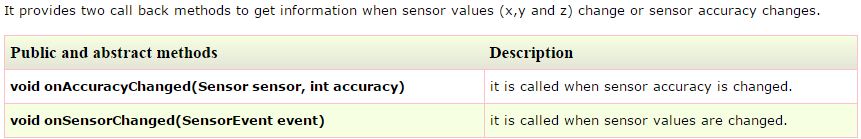 Android sensor api provides many classes and interface. The important classes and interfaces of sensor api are as follows: